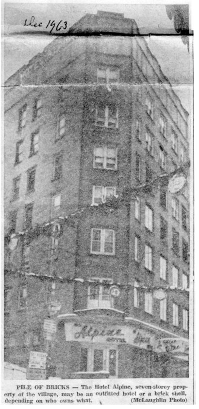 Only four floors of the Alpine were ever finished. The top three stories of the seven-story hotel were just framed out for rooms but all open. A short-lived weekly newspaper had offices up there, and there was also an artist’s studio, but I don’t remember much else about the place.
