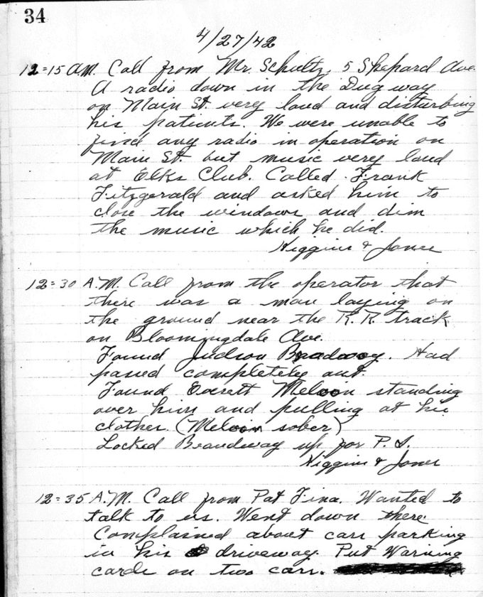4:15 a.m., 4-14-42 — Report from Glen Ryan that while coming from Bloomingdale he saw a man lying on the side of the pavement near McKillip’s farm. Probably drunk. I reported it to the State troopers. — Jones
