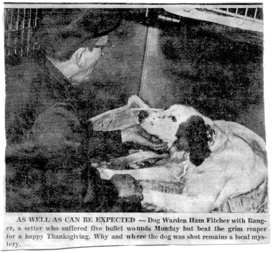 “This morning he was well on the road to recovery. When he gets home he will have a share of the family turkey but the mystery of who shot the dog will probably remain just that on the police blotter.”