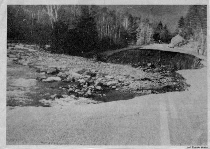 - A 75-yard section of state Route 9N was washed away as a result of the torrents of rain. This is the spot where four vehicles plunged into the rushing waters. The destructive force of the water could be seen in three sections of the road leading from Elizabethtown to Keene Valley. (Enterprise photo — Jeff Platsky)