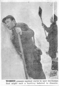 “With Olympic Bobsled Trials currently being held February 12-16 down the famed run at Mt. Van Hoevenberg near Lake Placid, NY, the sport spotlight is being focused for the first time since pre-war days on one of the most thrillingly breakneck sports ever devised by man. Riding a 507-pound bobsled, the helmeted riders begin the mile course from a standing start and drop the height of a 75-story building at speeds reaching 80 mph around sheer ice curves as high as 35 feet in slightly more than one minute. Most amazing feature of the fantastic pastime is that no fatal accidents have happened on the run although one sled sliced off tree tops for 110 feet after jumping the worst curve, Shady, at the half mile mark. Ten members of the crack German teams competing in the 1932 Olympic Games were in the hospital at the same time.