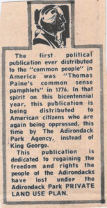 “The predominant, indisputable cry and appeal from the people of the Adirondacks at the 18 public hearings held by the League of Adirondack Citizen’s Rights, Inc., (4 public meetings).The Local Government Review Board (10 public meetings) and the Legislative Task Force to Investigate the APA (4 public meetings) has been an overwhelming plea to “Abolish the APA”.