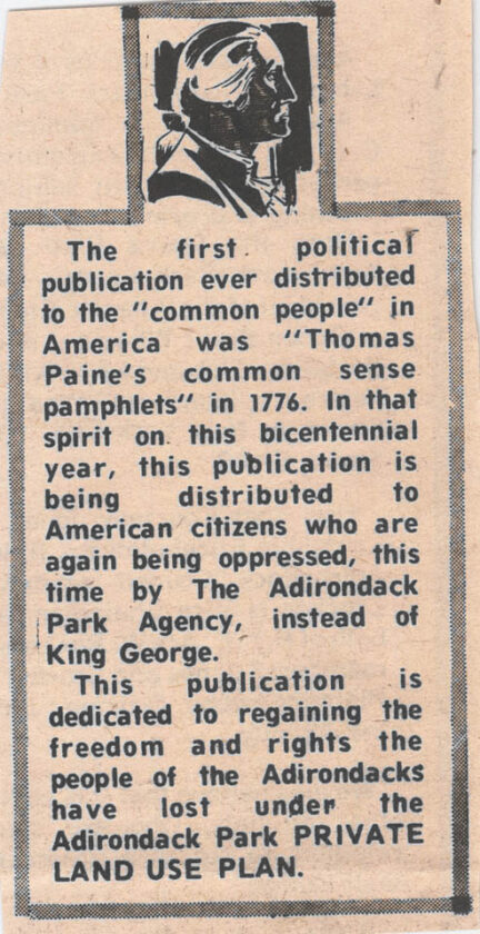Frank Casier and Bob Hunsicker established a four-page tabloid newspaper and defensively named it “The Adirondack Defender.” I am surprised the vitriolic language in the ‘news’ stories did not bring a lawsuit on my friend Frank.