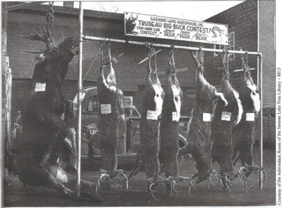 - Again, as I was finishing my purchase from my pal, Sam Grimone, a couple of young bucks came into the store and were listening to hunting stories from Sam. He was telling them about the Trudeau Big Buck Contest, so I dug out this photo of that yearly event in Saranac Lake. The location is 42 Main St., now Compass Printing, at that time, Saranac Lake Hardware parking lot next to the great music emporium, The Waterhole, then Mike & Sandy’s Restaurant. The photo was probably in the early 1950s but carries no date. We were able to make out three names of the shooters. From the left Alfred H. Martelle, next was Shirley McCarthy’s trophy and next to the last was Paul Roberts. The moose was shot in Quebec by Bob Liddy.