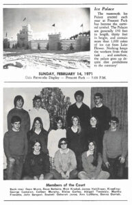 Without any careful research, it seems that the 1969 Winter Carnival was the last year that the king and queen were celebrities. I don’t have the 1970 program, but by 1971 the king and queen were local celebrities. Because the names of the king and queen were kept secret until the coronation ceremony, there are no Royalty pictures in the program.