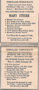 “Mary Steuer, 27, will seek the other trustee post. She is married, the mother of two children and was a teacher until the children were born. She is a graduate of the College of St. Rose in Albany and has master’s degree in special science from the State University in Albany.