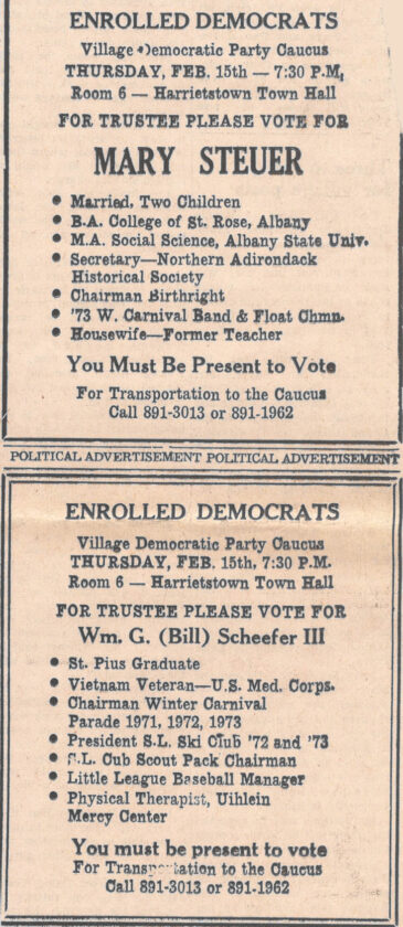 “Village Democratic chairman Frank Ratigan announced today that three persons had made it known to him that they will seek nominations for village office at the democratic caucus to be held Thursday night at 7:30 in the Harrietstown Town Hall.