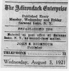 “Tourists are now enjoying the delights of Adirondack travel and they are seen in great numbers in the village every day. While there is any number of big limousines with the license plates from many states, there are also many cars of humbler motive power, carrying all the paraphernalia for camping.