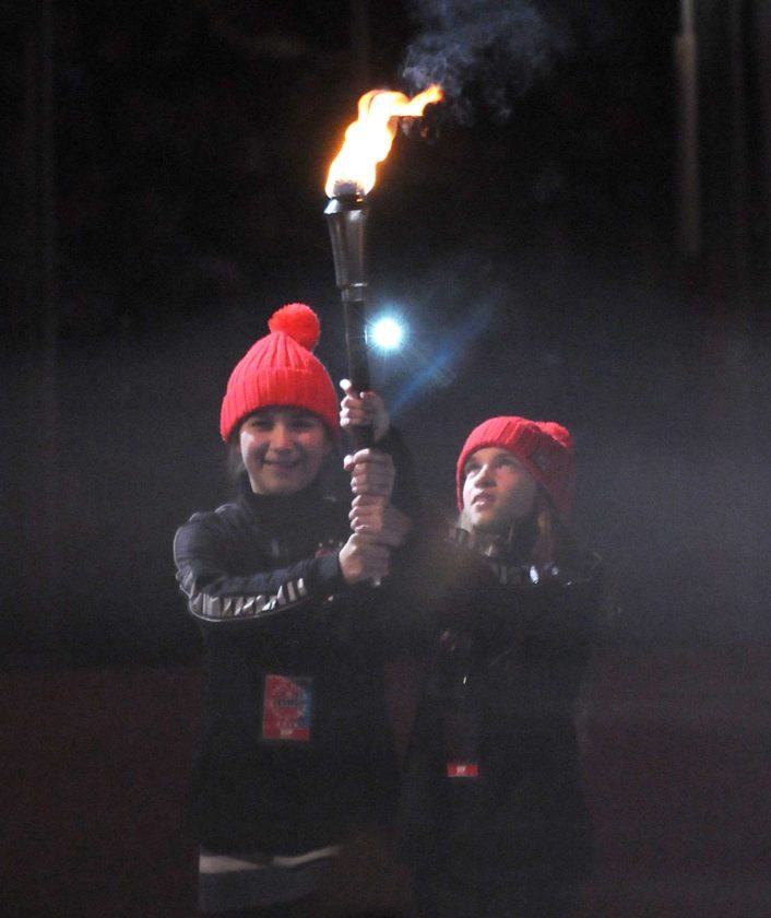 Saranac Lake Middle Schoolers Emma Wood, left, and Ruby Smith carry the Empire State Winter Games torch across the ice before handing it off for the lighting of the cauldron during the opening ceremonies in February 2016 at the Olympic Center in Lake Placid. (Enterprise photo — Lou Reuter)