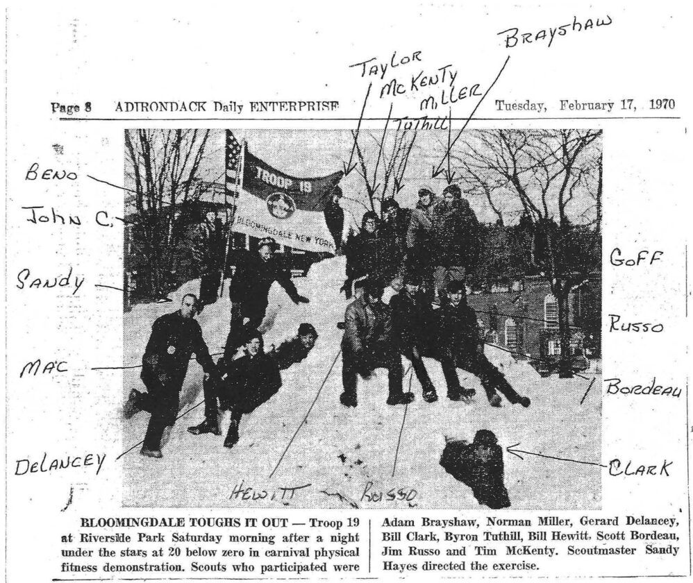 The mound of snow was so large and well-packed that each scout made their own igloo at different levels of the pile and some even made connecting tunnels so they could visit with their buddies without going outdoors. The scouts spent a total of 40 hours, including two nights of sub-zero temperatures, cooking all of their meals, demonstrating scouting skills and surviving. They even assisted with the Paul Smith’s College Woodsmen’s demonstrations held in the park on Saturday morning. Of course, the main reason that they volunteered was that they were looking for more wood for their campfires. Now, 56 years later, most of them can probably still recall every chilly detail. But, like they would say many years later: “That was back when we had a sharp troop.”