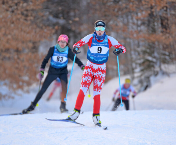 The Saranac Lake girls Nordic ski team currently sits in first place following Monday morning’s opening day of the NYSPHSAA Skiing Championship at the Bristol Mountain Ski Resort.