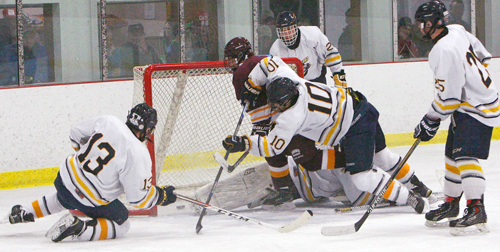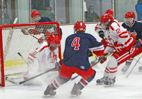 Saranac Lake sophomore goaltender Bruno Freeman smothers a scoring attempt by Niskayuna’s Michael McCalig (4) as Drew Sturgeon (12) supports the play Saturday at the Saranac Lake Civic Center. (Photo — Roy Bombard)