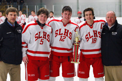 From left, Saranac Lake head coach Will Ellsworth, Casey Sturgeon, Drew Sturgeon, JB Chapin and assistant coach Shawn O’Brien accept the Casey McHugh Memorial Tournament championship trophy Saturday after beating Niskayuna 3-1 and Burnt Hills 3-2 on Friday. (Photo — Roy Bombard)