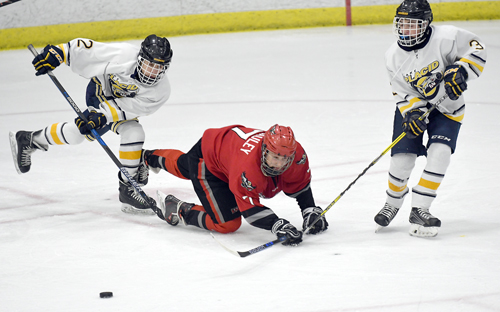 Lake Placid freshmen Tyler Hinckley (2) and Hunter Wilmot flank Beekmantown’s Josh McCauley during Thursday’s Section VII semifinal game at the Olympic Center in Lake Placid. (Enterprise photo — Lou Reuter)