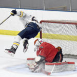 Lake Placid’s Kevin Geesler goes airborne while Beekmantown goalie Cole Harvey smothers the puck during Thursday’s Section VII semifinal contest at the Olympic Center’s 1932 Rink. (Enterprise photo — Lou Reuter)