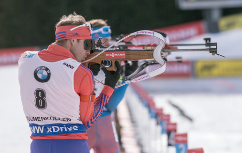 Lowell Bailey takes aim during the World Cup biathlon mass start Sunday in Oslo, Norway. (Photo — US Biathlon/Nordic Focus)