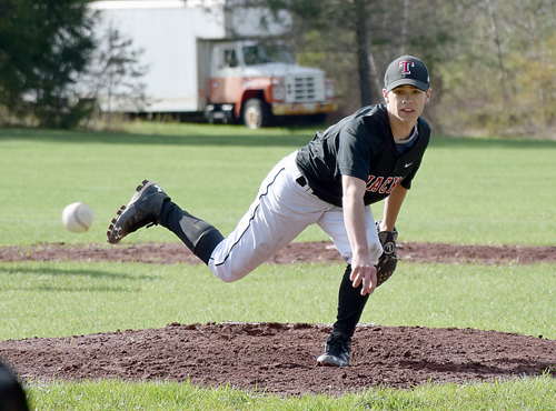 Tupper Lake junior Ben Casagrain throws a pitch early in the game Wednesday afternoon against St. Lawrence in Tupper Lake. (Enterprise photo — Justin A. Levine)