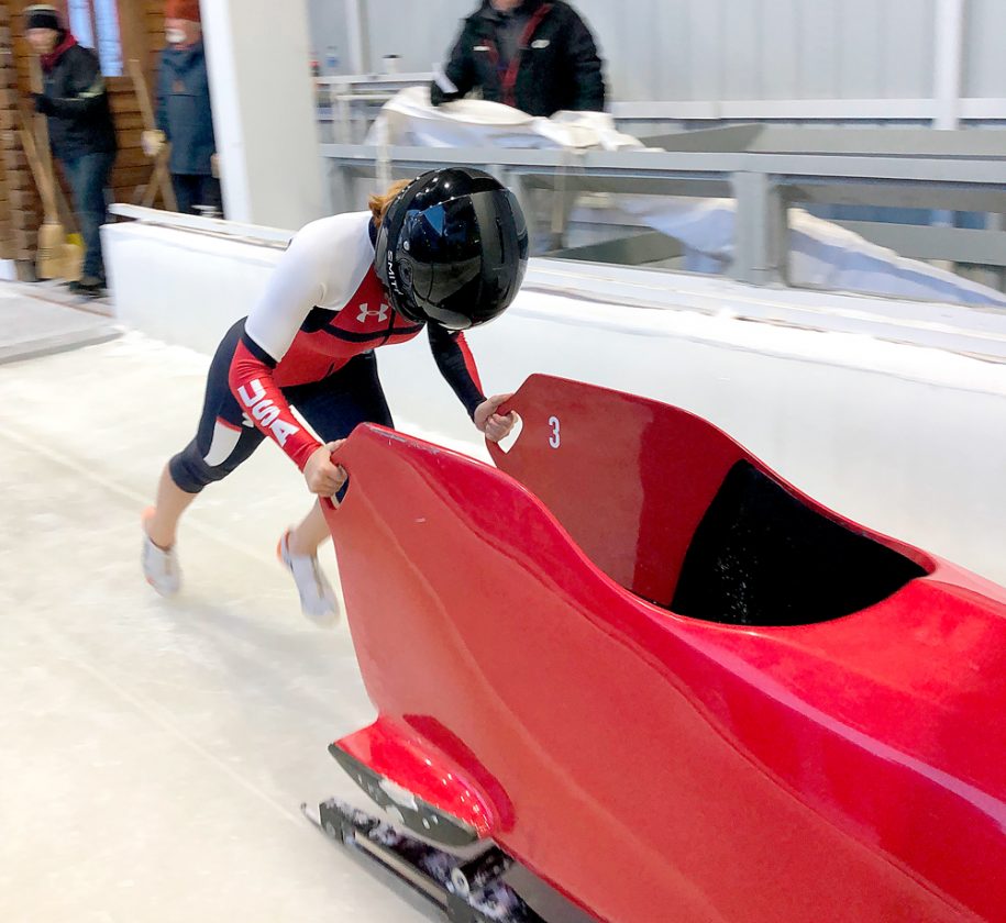 Lake Placid High School student Maddy Cohen pushes her bobsled during a competition in Lake Placid. She qualified for Youth Olympic Games, which take place in Lausanne, Switzerland in 2020, after finishing the season with an overall third-place world standing. She had two second places in Lake Placid and two third places in Park City, Utah. (Photo provided)