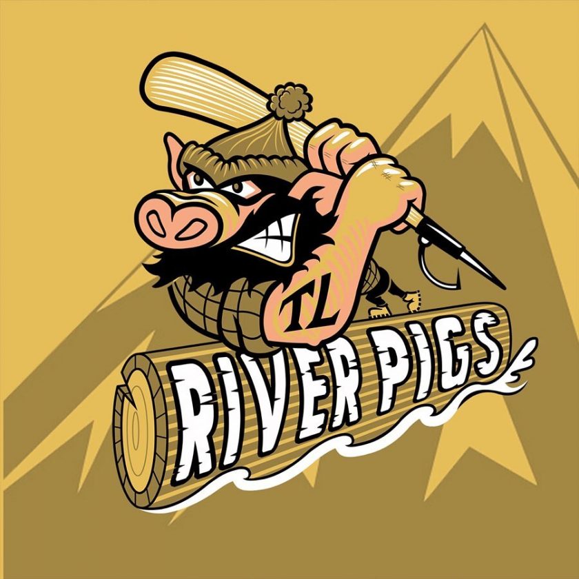 The river pig on this team logo is an actual swine, sporting a beard, hat and “TL” tattoo, fiercely gritting his teeth. He holds a bat, that on one end transforms into a pike used to push logs around. The cleats he grips the log underfoot with could be used on a baseball diamond, too.