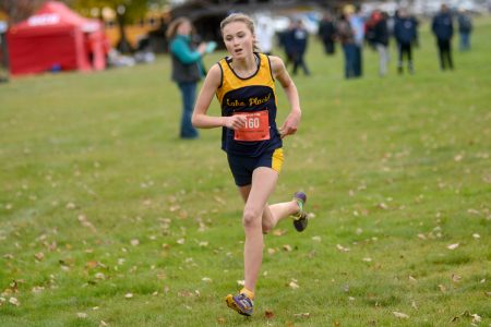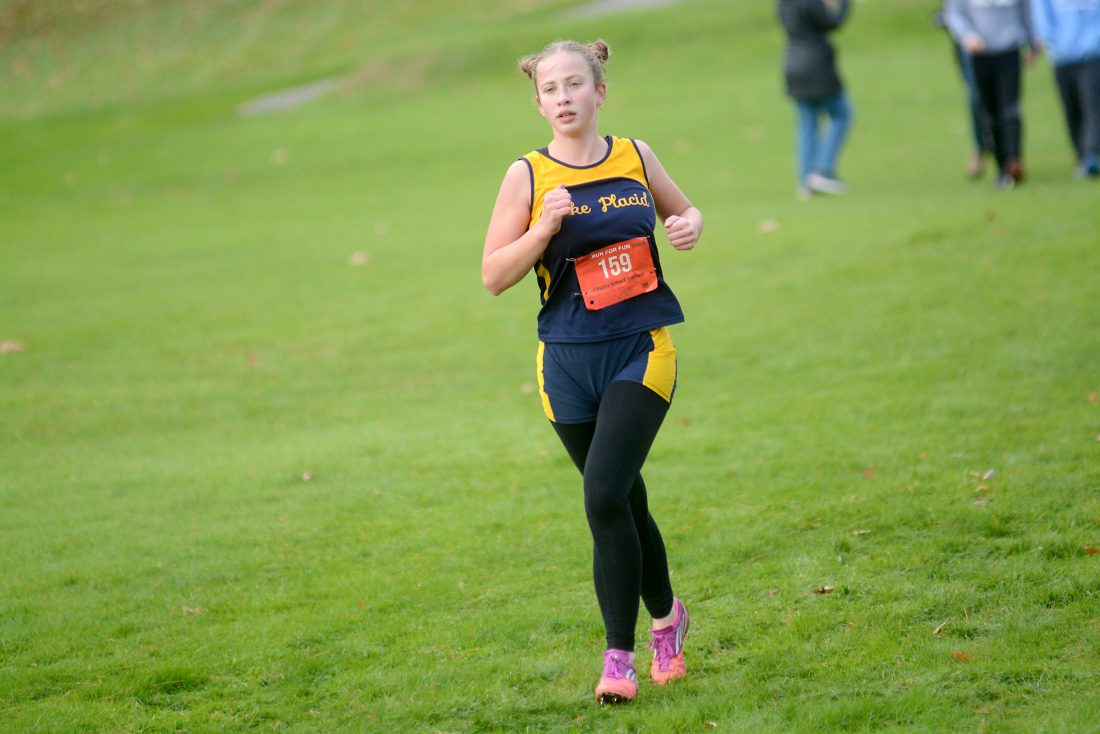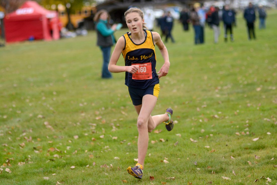Lake Placid's Samantha Damico nears the finish line during Friday's Section VII cross country championship at Cobble Hill Golf Course in Elizabethtown. (Enterprise photo — Parker O’Brien)