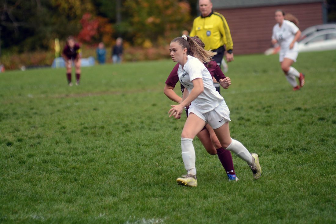 - Paul Smith’s Kate Roefs runs during a game against Albany College of Pharmacy and Health Sciences on Oct. 10. (Enterprise photo— Parker O’Brien)