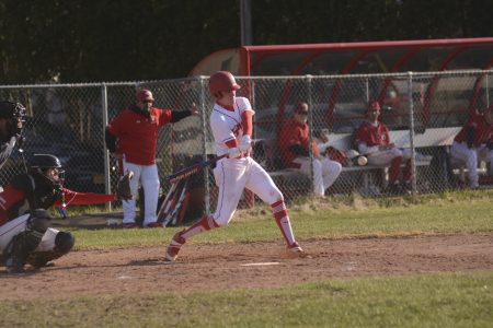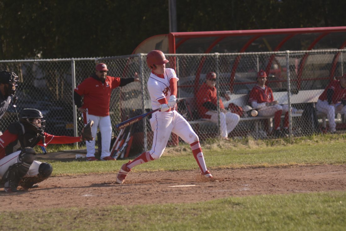 Saranac Lake’s Brady Roberts takes a cut at the ball driving it to the outfield for a single during Friday’s game against Saranac Central. (Enterprise photo — Parker O’Brien)