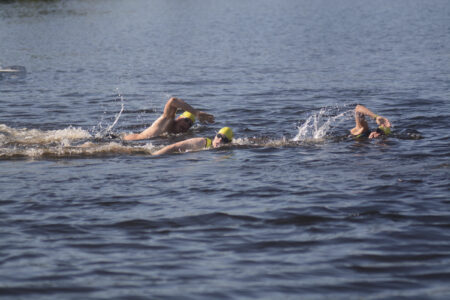 - Tupper Lake Tinman sprint distance competitors swim during Saturday’s race. (Enterprise photo — Parker O’Brien)