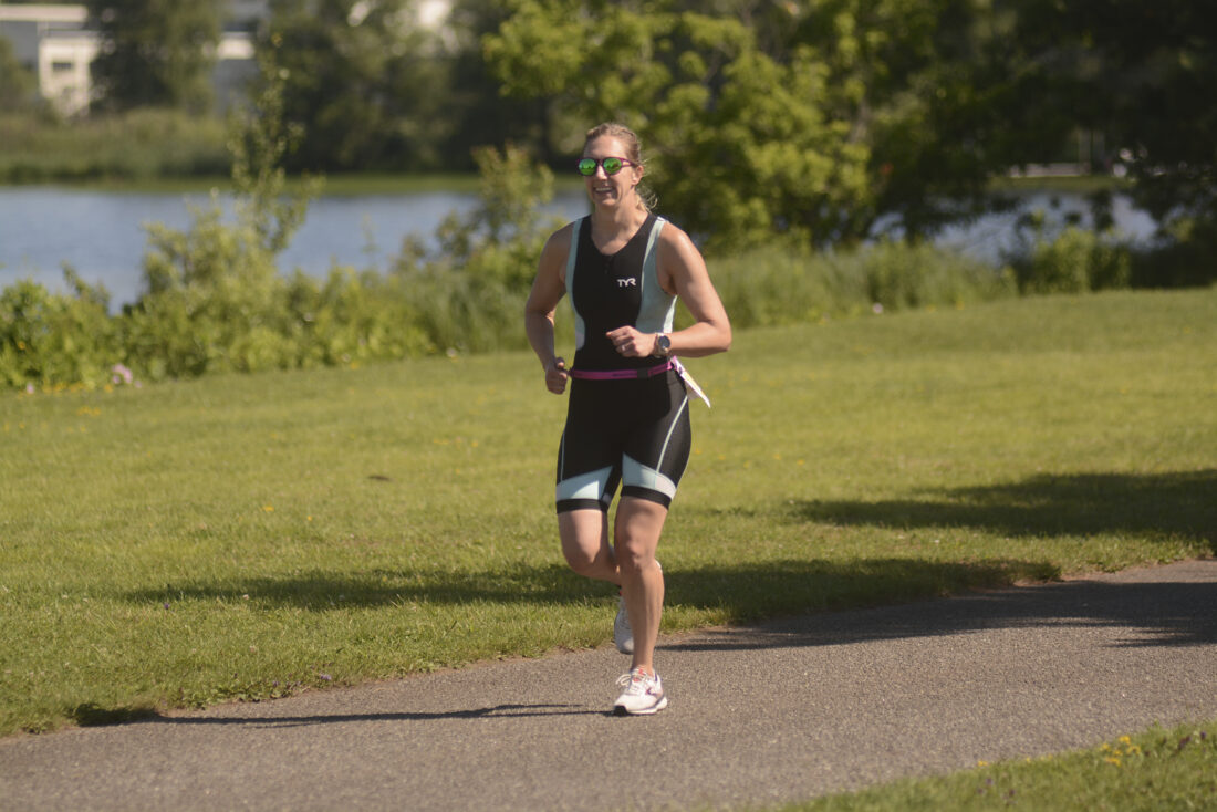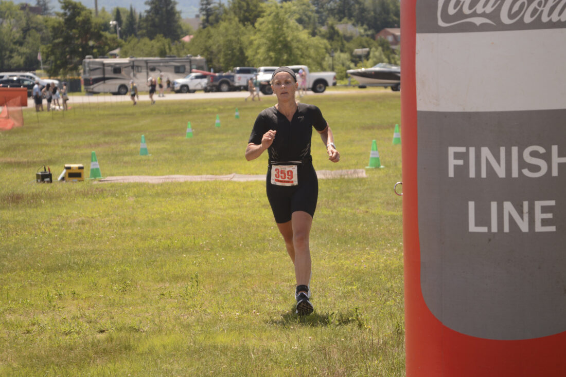 - Julianne Heykoop, of Glenwood, New Jersey, nears the finish line of the Tupper Lake Tinman on Saturday at the Tupper Lake Municipal Park. (Enterprise photo — Parker O’Brien)