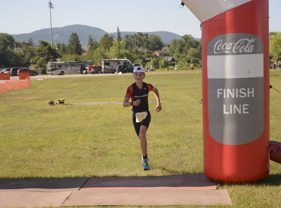 - Simon Roy, of Quebec, Canada, smiles while crossing the finish line in Saturday’s 40th annual Tupper Lake Tinman Triathlon. Roy, 14, was the first racer to cross the finish line on Saturday and won the sprint distance triathlon in 1:15:03.9. (Enterprise photo — Parker O’Brien)