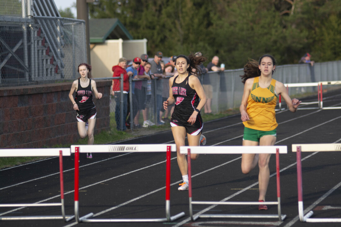 - Tupper Lake’s Olivia Ellis gets ready to jump over a hurdle in the 400-meter hurdle event on May 11. (Enterprise photo — Parker O’Brien)