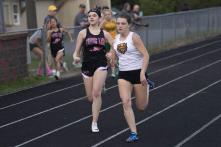 - Tupper Lake’s Lacey Tarbox, left, competes side-by-side with Canton’s Rori McCarthy in the 200-meter dash during Thursday’s meet. (Enterprise photo — Parker O’Brien)