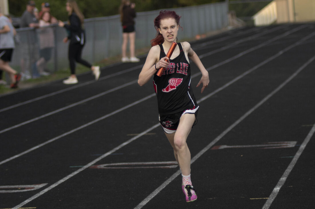Tupper Lake’s Raegan Fritts competes in the final leg of the 4x400 relay on Thursday. (Enterprise photo — Parker O’Brien)