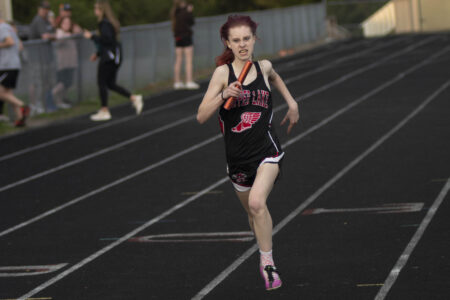- Tupper Lake’s Raegan Fritts competes in the final leg of the 4×400 relay on Thursday. (Enterprise photo — Parker O’Brien)