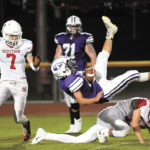 - Saranac Lake defensive back Rhett Darrah upends Ticonderoga running back Ty Schlogl during the second half of Friday’s game. (Enterprise photo — Lou Reuter)