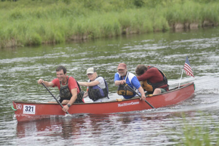 - Jim Susville, Jennie Susville, Nick Gowens and Chris Burnham dig their paddles in as they approach the finish line of the Willard Hanmer Guideboat and Canoe race on Sunday. (Enterprise photo — Parker O’Brien)