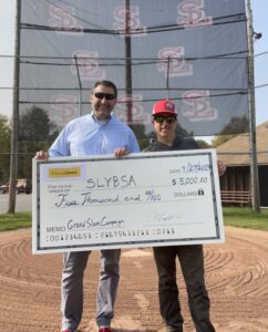 - Matt Theis of Edward Jones, left, holds a ceremonial check with Saranac Lake Youth Baseball and Softball Association President Chris Knight at home plate at Rotary Field in Saranac Lake on Wednesday. Edward Jones recently became the first Grand Slam-level ($5,000) donor to the association’s Grand Slam Campaign. SLYBSA is raising funds to upgrade Rotary and Elks fields. As of this week, the campaign had raised almost $9,000 toward its overall $40,000 goal. For more information on the Grand Slam Campaign, visit www.slybsa.org/donate, email slybsa@outlook.com or call/text 518-637-5814. (Provided photo)