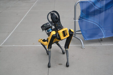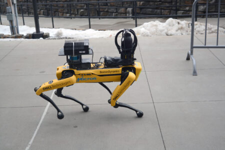 Scoobie, a Boston Dynamics robot dog, poses during the FIL Luge World Cup in Lake Placid on Saturday. Skipp Findley of Virginia, who brought the robotic dog to FIL Luge World Cup, was invited to Lake Placid by local EMS. Findley is a layout engineer and says he uses the robotic dog every day.