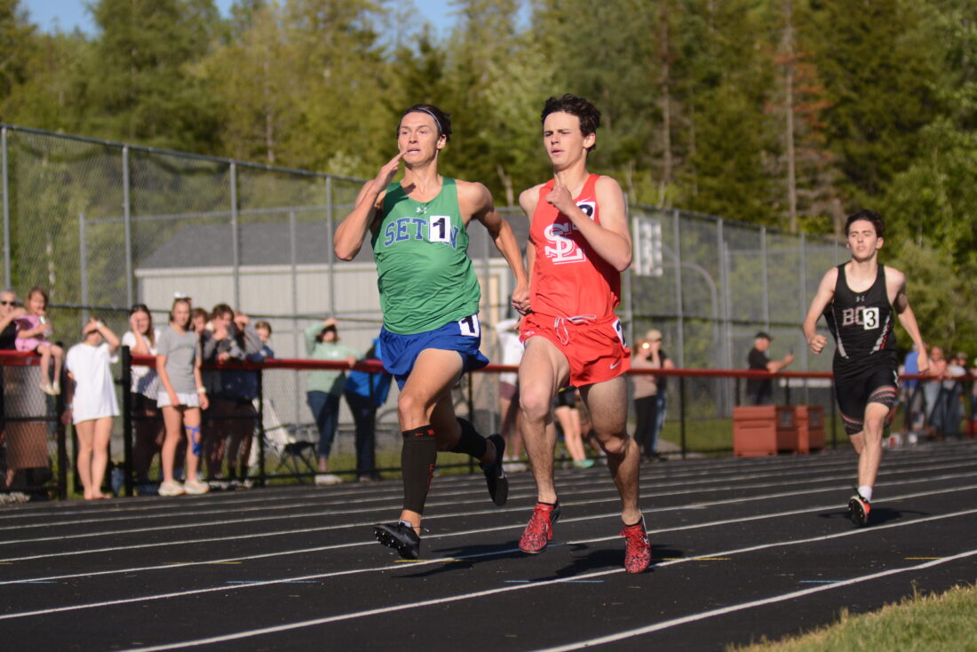 - Saranac Lake’s Jake Kollmer, right, races alongside Seton Catholic’s Aiden Pearl in the boys 800-meter competition during Friday’s Section VII state qualifiers event in Saranac Lake. Kollmer edged out Pearl by 0.32 seconds to secure a spot at the NYSPHSAA Outdoor Track and Field Championships at Cicero-North Syracuse High School on June 7 and 8. (Enterprise photo — Parker O’Brien)