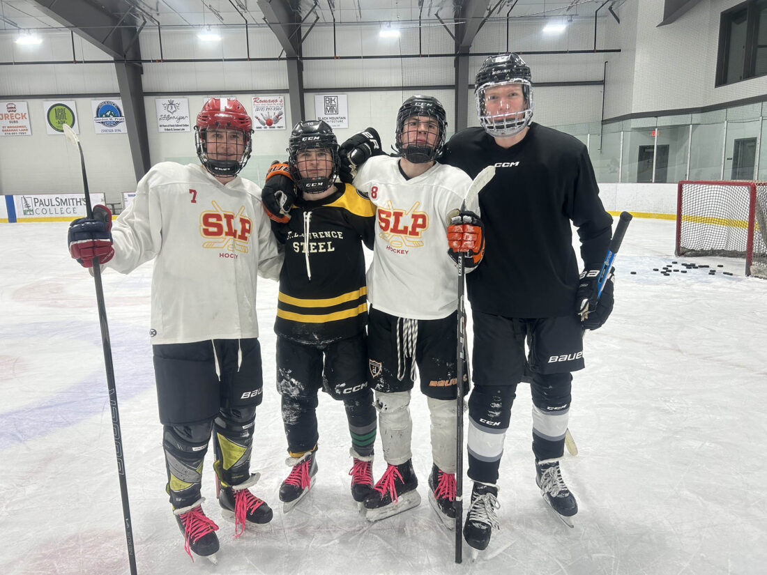 From left, SLP's all-stars Ethan Knight, Carson St. Louis, Ayden McCormick and Braydon Harvey pose for a photo following Thursday's final team practice at the Saranac Lake Civic Center. (Enterprise photo — Parker O’Brien)