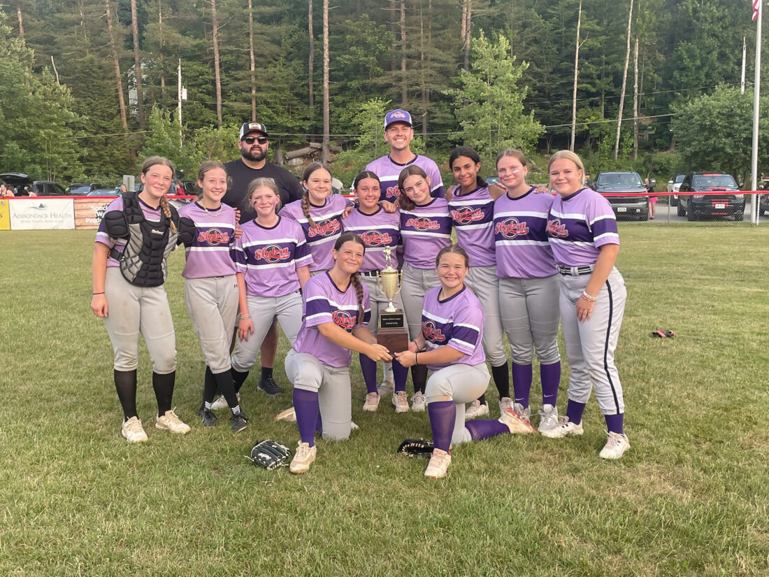 Saranac Lake’s High Peaks Landscaping team captured the girls major softball championship on Monday with a 20-17 come-from-behind victory over their hometown rivals, Rapid Roofing at Rotary Field in Saranac Lake. Pictured from left in the front are Aaliyah Anastasia and Marissa Reardon. In the middle are Nelliana Pillen, Emily Knight, Claire Smith, Karleigh Moody, Khloey LaPage, Kathryn Raymond, Ella Muldowney, Kayla Harvey and Lucy Duffy. In the back are coach and High Peaks Landscaping owner Codey LaPage and head Coach Ben Clark. Not pictured is Maya Lynch. (Provided photo)