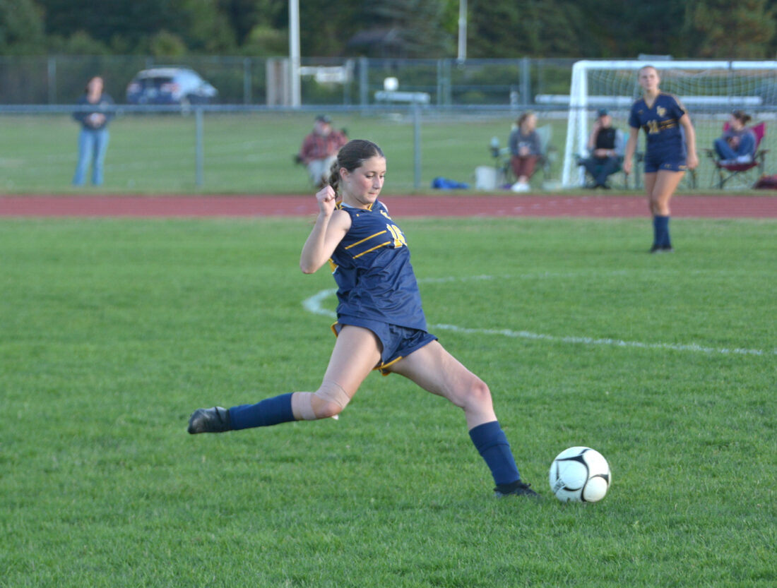 - Lake Placid’s Olivia St. Louis kicks the ball downfield during Wednesday’s home game against Boquet Valley. (Enterprise photo — Parker O’Brien)