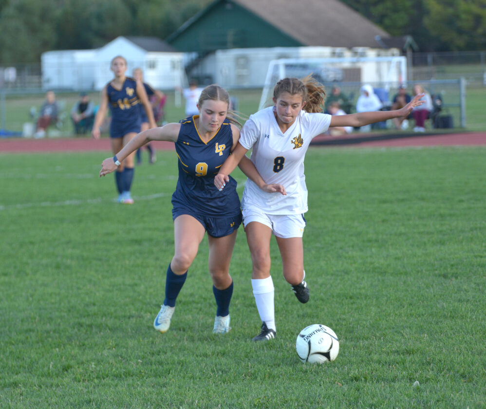 - Lake Placid’s Kendra Levitt, left, and Boquet Valley’s Olivia Hathaway fight for the ball during Wednesday’s game. (Enterprise photo — Parker O’Brien)