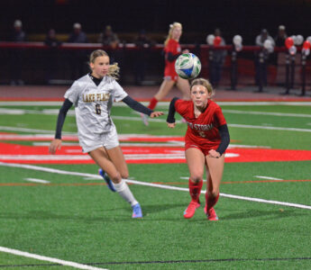 - Saranac Lake’s Layne Locke, right, keeps her eyes on the ball with Lake Placid’s Eliza Fitzsimmons defending during Thursday’s game. (Enterprise photo — Parker O’Brien)