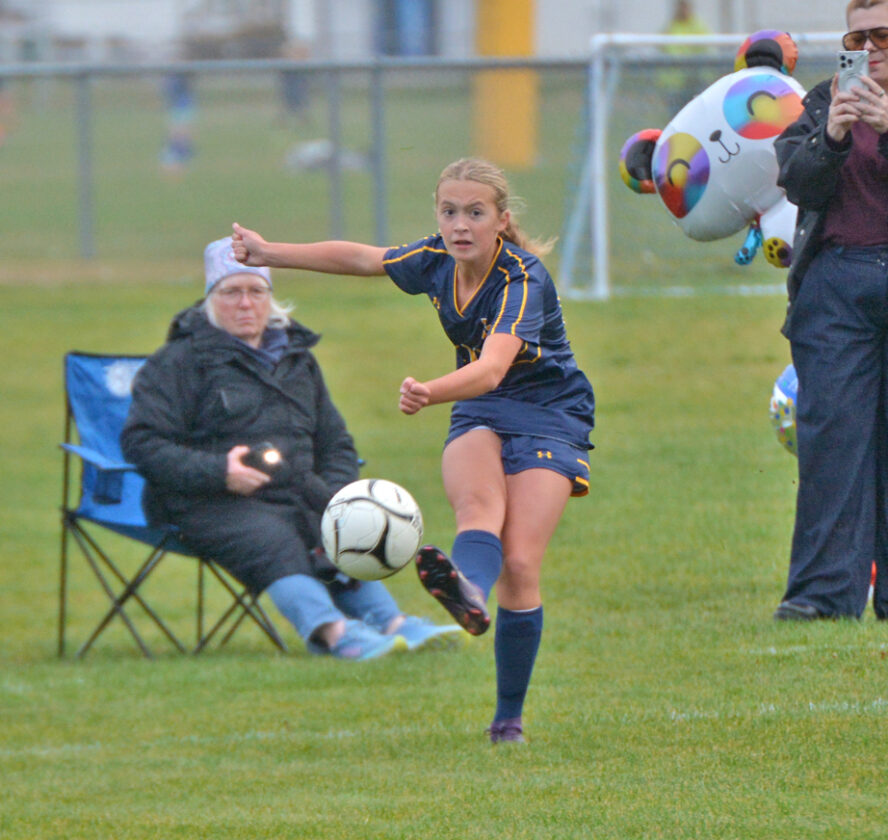 - Lake Placid’s Cecilia Norfolk kicks the ball during Tuesday’s game against Indian Lake/Long Lake. (Enterprise photo — Parker O’Brien)