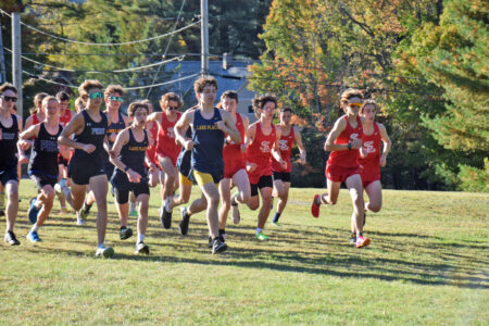 Lake Placid and Saranac Lake boys cross country runners take off at the start of Tuesday’s meet at the Dewey Mountain Recreation Center in Saranac Lake. (Enterprise photo — Chris Gaige)