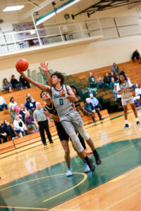 Paul Smiths’ Manny Belcher lays up a shot against Great Bay CC. (Provided photo — PSC/Mercedes Rideout)