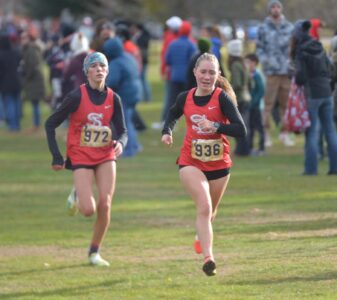 - Saranac Lake’s Cadence Kennedy, right, and teammate FinnLee Orapallo near the finish line of the Section VII Championships at the Cobble Hill Golf Course in Elizabethtown on Friday. (Enterprise photo — Parker O’Brien)