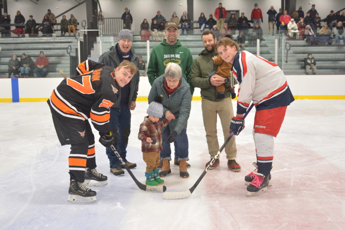 Family members of Casey McHugh prepare to drop the ceremonial first puck with Plattsburgh’s Lucas Dashnaw and SLP’s Ethan Knight Friday at the Saranac Lake Civic Center. (Enterprise photo — Parker O’Brien)