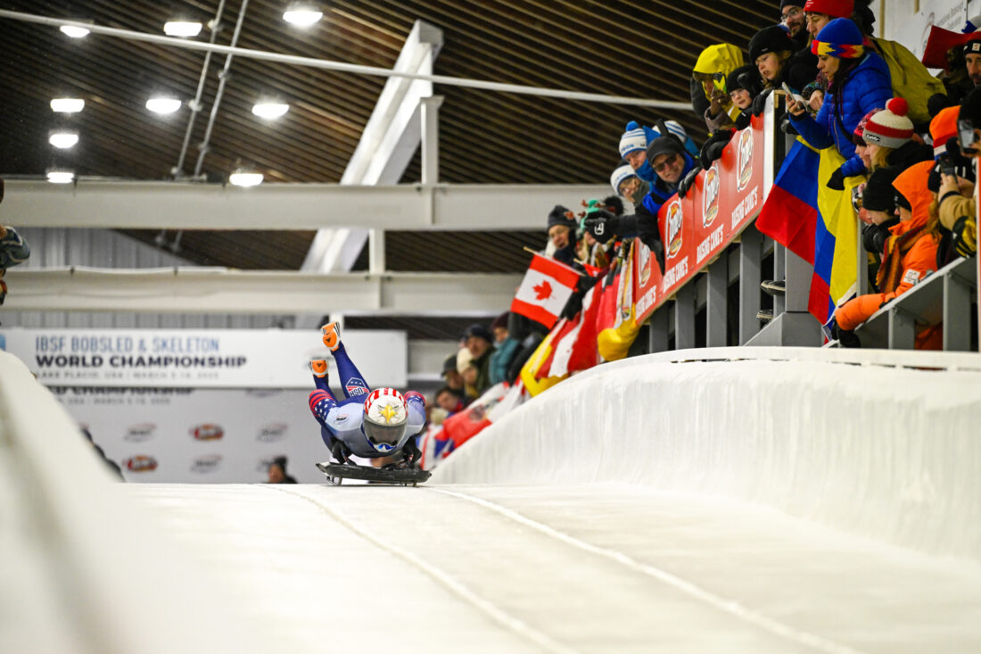 Katie Uhlaender, of the United States, slides during the Lake Placid skeleton world championships in March 2025. (Provided photo — IBSF)