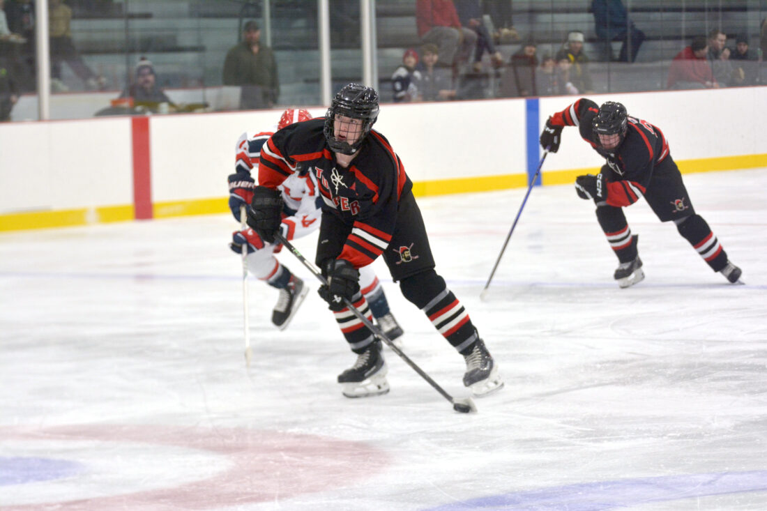 - SLP’s Ayden McCormick carries the puck during Tuesday’s game against Tupper Lake at the Saranac Lake Civic Center. (Enterprise photo — Parker O’Brien)